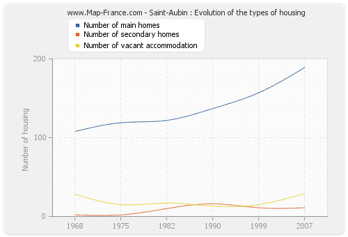 The following graphs show the history of the number and the type of housing of Saint-Aubin from 1968 to 2007. The second graph is drawn in cubic interpolation. This allows to obtain more exactly the number of accommodation of the town of Saint-Aubin years where no inventory was made.