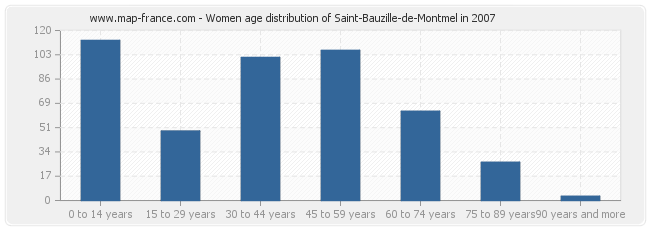 - Saint-Bauzille-de-Montmel women inhabitants from 30 to 44 years : 101