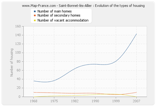 The following graphs show the history of the number and the type of housing of Saint-Bonnet-lès-Allier from 1968 to 2007. The second graph is drawn in cubic interpolation. This allows to obtain more exactly the number of accommodation of the town of Saint-Bonnet-lès-Allier years where no inventory was made.