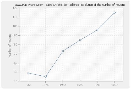The population of Saint-Christol-de-Rodières was 159 inhabitants in 2007, 126 inhabitants in 1999, 130 inhabitants in 1990, 110 inhabitants in 1982, 95 inhabitants in 1975 and 108 inhabitants in 1968. Meanwhile, the number of housing of Saint-Christol-de-Rodières was 115 in 2007, 96 in 1999, 85 in 1990, 73 in 1982, 45 in 1975 and 49 in 1968.