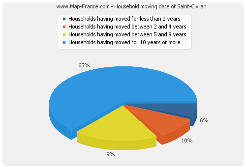 - Number of households of Saint-Civran having moved between 2 and 5 years : 8 - Number of households of Saint-Civran having moved between 5 and 9 years : 16 - Number of households of Saint-Civran having moved for 10 years or more : 54 |