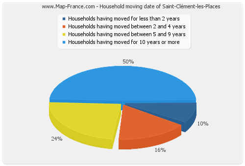 - Number of households of Saint-Clément-les-Places having moved between 2 and 5 years : 38 - Number of households of Saint-Clément-les-Places having moved between 5 and 9 years : 56 - Number of households of Saint-Clément-les-Places having moved for 10 years or more : 115 |