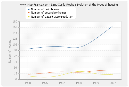 The following graphs show the history of the number and the type of housing of Saint-Cyr-la-Roche from 1968 to 2007. The second graph is drawn in cubic interpolation. This allows to obtain more exactly the number of accommodation of the town of Saint-Cyr-la-Roche years where no inventory was made.