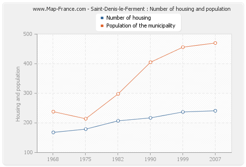 The population of Saint-Denis-le-Ferment was 470 inhabitants in 2007, 456 inhabitants in 1999, 405 inhabitants in 1990, 298 inhabitants in 1982, 214 inhabitants in 1975 and 238 inhabitants in 1968. Meanwhile, the number of housing of Saint-Denis-le-Ferment was 241 in 2007, 237 in 1999, 217 in 1990, 207 in 1982, 179 in 1975 and 168 in 1968.