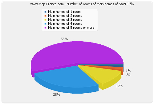 - Number of main homes of Saint-Félix of 1 room : 1 - Number of main homes of Saint-Félix of 2 rooms : 2 - Number of main homes of Saint-Félix of 3 rooms : 19 - Number of main homes of Saint-Félix of 4 rooms : 19 - Number of main homes of Saint-Félix of 5 rooms and more : 92 |
