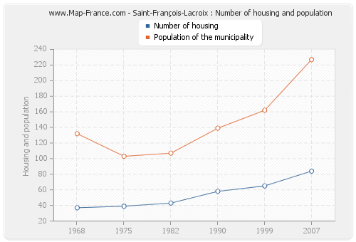 The population of Saint-François-Lacroix was 227 inhabitants in 2007, 162 inhabitants in 1999, 139 inhabitants in 1990, 107 inhabitants in 1982, 103 inhabitants in 1975 and 132 inhabitants in 1968. Meanwhile, the number of housing of Saint-François-Lacroix was 84 in 2007, 65 in 1999, 58 in 1990, 43 in 1982, 39 in 1975 and 37 in 1968.