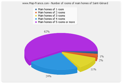 - Number of main homes of Saint-Génard of 1 room : 1 - Number of main homes of Saint-Génard of 2 rooms : 3 - Number of main homes of Saint-Génard of 3 rooms : 15 - Number of main homes of Saint-Génard of 4 rooms : 15 - Number of main homes of Saint-Génard of 5 rooms and more : 82 |
