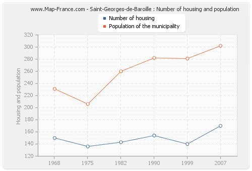 The population of Saint-Georges-de-Baroille was 302 inhabitants in 2007, 281 inhabitants in 1999, 282 inhabitants in 1990, 260 inhabitants in 1982, 206 inhabitants in 1975 and 231 inhabitants in 1968. Meanwhile, the number of housing of Saint-Georges-de-Baroille was 170 in 2007, 140 in 1999, 154 in 1990, 143 in 1982, 136 in 1975 and 150 in 1968.