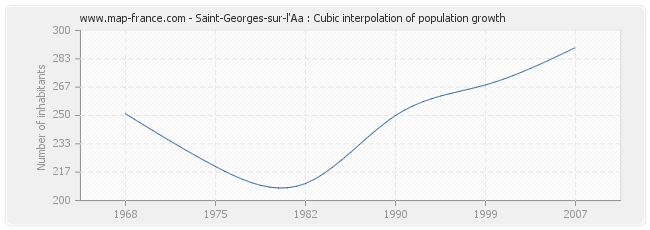 This curve shows the history of the population of Saint-Georges-sur-l'Aa from 1968 to 2007 in cubic interpolation. This provides more precisely the population of the municipality of Saint-Georges-sur-l'Aa the years where no census has been taken.