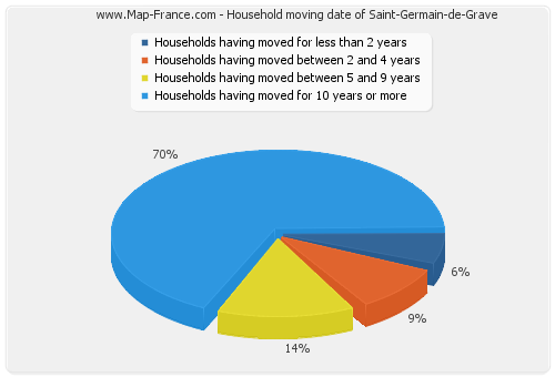 - Number of households of Saint-Germain-de-Grave having moved between 2 and 5 years : 6 - Number of households of Saint-Germain-de-Grave having moved between 5 and 9 years : 9 - Number of households of Saint-Germain-de-Grave having moved for 10 years or more : 45 |