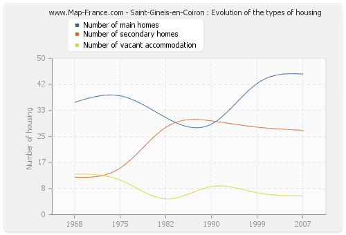 The following graphs show the history of the number and the type of housing of Saint-Gineis-en-Coiron from 1968 to 2007. The second graph is drawn in cubic interpolation. This allows to obtain more exactly the number of accommodation of the town of Saint-Gineis-en-Coiron years where no inventory was made.