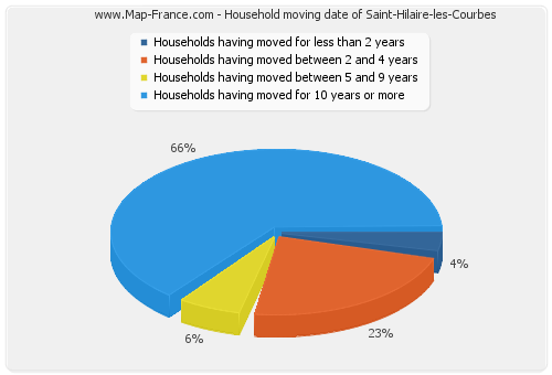 - Number of households of Saint-Hilaire-les-Courbes having moved between 2 and 5 years : 18 - Number of households of Saint-Hilaire-les-Courbes having moved between 5 and 9 years : 5 - Number of households of Saint-Hilaire-les-Courbes having moved for 10 years or more : 51 |
