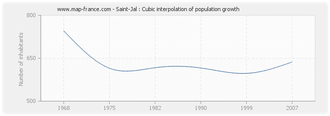 This curve shows the history of the population of Saint-Jal from 1968 to 2007 in cubic interpolation. This provides more precisely the population of the municipality of Saint-Jal the years where no census has been taken.