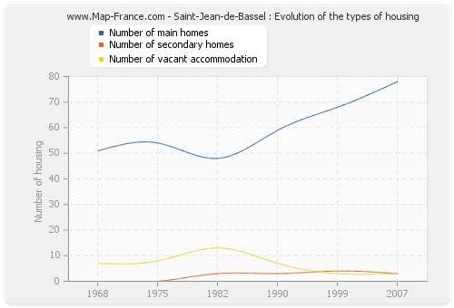 The following graphs show the history of the number and the type of housing of Saint-Jean-de-Bassel from 1968 to 2007. The second graph is drawn in cubic interpolation. This allows to obtain more exactly the number of accommodation of the town of Saint-Jean-de-Bassel years where no inventory was made.