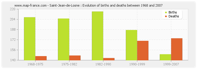 Saint-Jean-de-Losne : evolution of births and deaths from 1968 to 2007