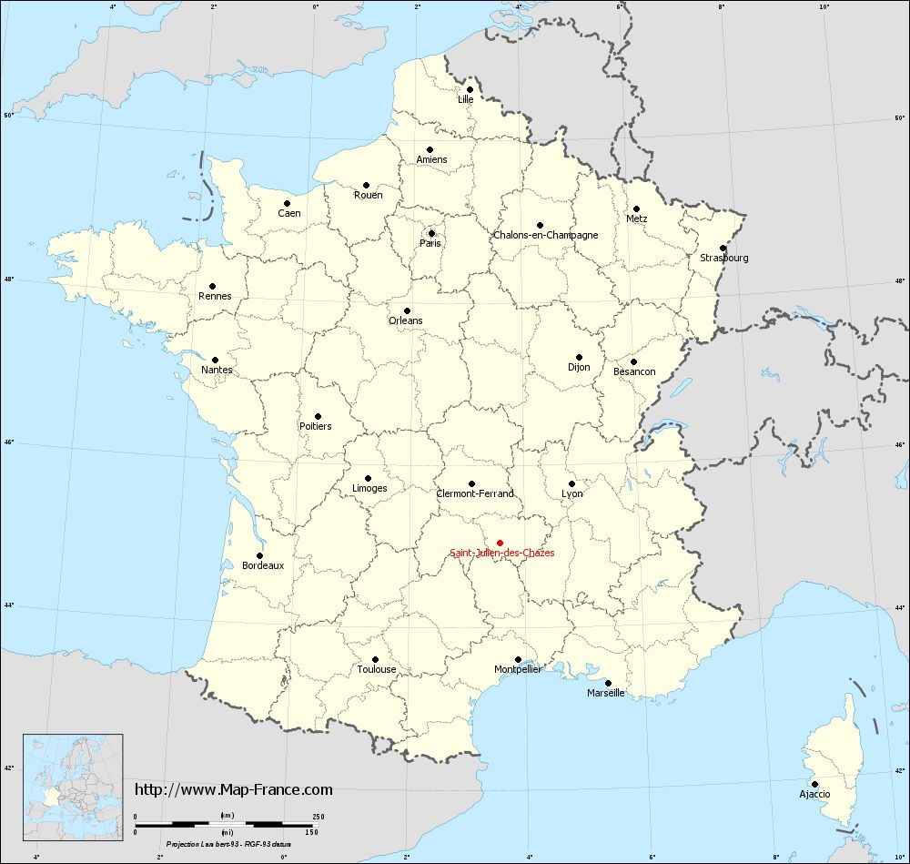 Map of Saint-Julien-des-Chazes with regions and prefectures