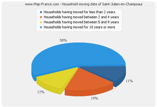 - Number of households of Saint-Julien-en-Champsaur having moved between 2 and 5 years : 25 - Number of households of Saint-Julien-en-Champsaur having moved between 5 and 9 years : 16 - Number of households of Saint-Julien-en-Champsaur having moved for 10 years or more : 77 |