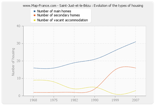The number of housing of Saint-Just-et-le-Bézu was 50 in 2007, 42 in 1999, 30 in 1990, 25 in 1982, 26 in 1975 and 27 in 1968.