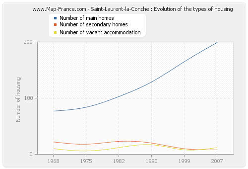 The following graphs show the history of the number and the type of housing of Saint-Laurent-la-Conche from 1968 to 2007. The second graph is drawn in cubic interpolation. This allows to obtain more exactly the number of accommodation of the town of Saint-Laurent-la-Conche years where no inventory was made.