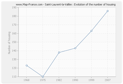 The population of Saint-Laurent-la-Vallée was 257 inhabitants in 2007, 270 inhabitants in 1999, 258 inhabitants in 1990, 238 inhabitants in 1982, 280 inhabitants in 1975 and 316 inhabitants in 1968. Meanwhile, the number of housing of Saint-Laurent-la-Vallée was 186 in 2007, 163 in 1999, 143 in 1990, 138 in 1982, 110 in 1975 and 123 in 1968.