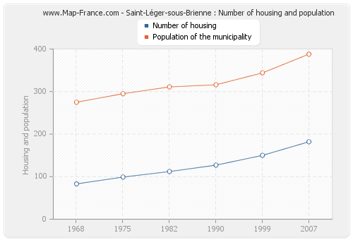 The population of Saint-Léger-sous-Brienne was 388 inhabitants in 2007, 344 inhabitants in 1999, 316 inhabitants in 1990, 311 inhabitants in 1982, 295 inhabitants in 1975 and 275 inhabitants in 1968. Meanwhile, the number of housing of Saint-Léger-sous-Brienne was 182 in 2007, 150 in 1999, 127 in 1990, 112 in 1982, 99 in 1975 and 83 in 1968.