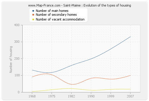 The following graphs show the history of the number and the type of housing of Saint-Maime from 1968 to 2007. The second graph is drawn in cubic interpolation. This allows to obtain more exactly the number of accommodation of the town of Saint-Maime years where no inventory was made.
