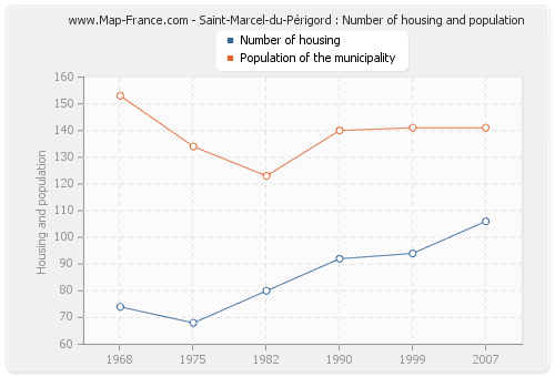 The population of Saint-Marcel-du-Périgord was 141 inhabitants in 2007, 141 inhabitants in 1999, 140 inhabitants in 1990, 123 inhabitants in 1982, 134 inhabitants in 1975 and 153 inhabitants in 1968. Meanwhile, the number of housing of Saint-Marcel-du-Périgord was 106 in 2007, 94 in 1999, 92 in 1990, 80 in 1982, 68 in 1975 and 74 in 1968.