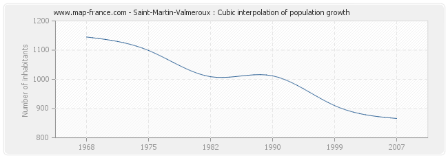 Population of Saint-Martin-Valmeroux was 866 inhabitants in 2007, 910 inhabitants in 1999, 1 012 inhabitants in 1990, 1 009 inhabitants in 1982, 1 099 inhabitants in 1975 and 1 145 inhabitants in 1968.