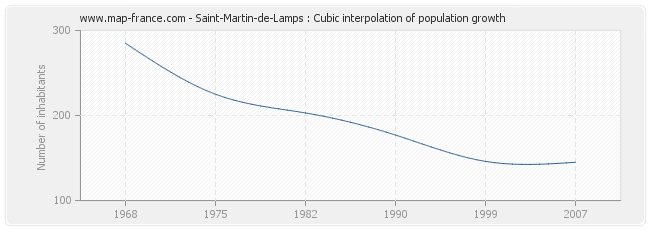 This curve shows the history of the population of Saint-Martin-de-Lamps from 1968 to 2007 in cubic interpolation. This provides more precisely the population of the municipality of Saint-Martin-de-Lamps the years where no census has been taken.