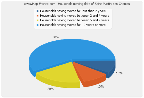 - Number of households of Saint-Martin-des-Champs having moved between 2 and 5 years : 16 - Number of households of Saint-Martin-des-Champs having moved between 5 and 9 years : 30 - Number of households of Saint-Martin-des-Champs having moved for 10 years or more : 92 |