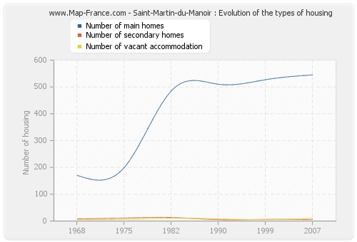 The following graphs show the history of the number and the type of housing of Saint-Martin-du-Manoir from 1968 to 2007. The second graph is drawn in cubic interpolation. This allows to obtain more exactly the number of accommodation of the town of Saint-Martin-du-Manoir years where no inventory was made.