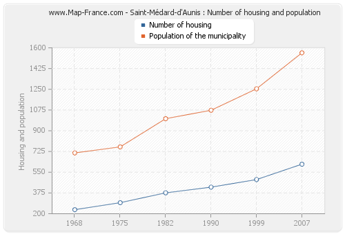 The population of Saint-Médard-d'Aunis was 1 558 inhabitants in 2007, 1 254 inhabitants in 1999, 1 073 inhabitants in 1990, 1 002 inhabitants in 1982, 764 inhabitants in 1975 and 713 inhabitants in 1968. Meanwhile, the number of housing of Saint-Médard-d'Aunis was 618 in 2007, 488 in 1999, 424 in 1990, 376 in 1982, 293 in 1975 and 234 in 1968.