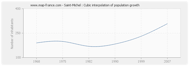 This curve shows the history of the population of Saint-Michel from 1968 to 2007 in cubic interpolation. This provides more precisely the population of the municipality of Saint-Michel the years where no census has been taken.