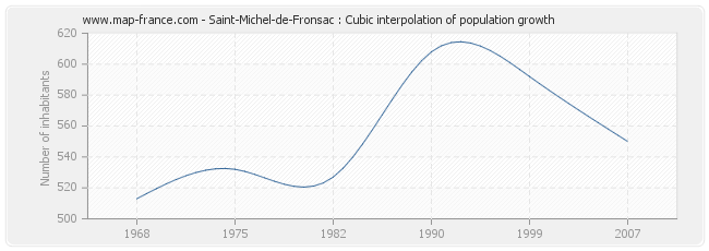 This curve shows the history of the population of Saint-Michel-de-Fronsac from 1968 to 2007 in cubic interpolation. This provides more precisely the population of the municipality of Saint-Michel-de-Fronsac the years where no census has been taken.