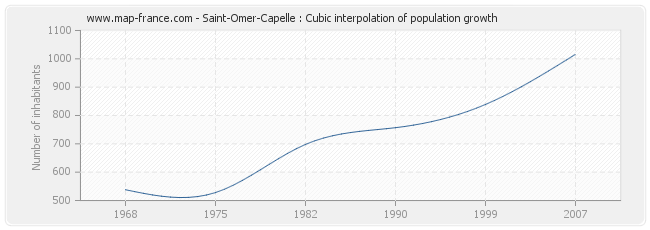 Population of Saint-Omer-Capelle was 1 016 inhabitants in 2007, 839 inhabitants in 1999, 757 inhabitants in 1990, 698 inhabitants in 1982, 528 inhabitants in 1975 and 538 inhabitants in 1968.