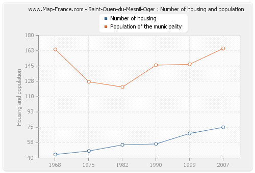 The population of Saint-Ouen-du-Mesnil-Oger was 165 inhabitants in 2007, 147 inhabitants in 1999, 146 inhabitants in 1990, 121 inhabitants in 1982, 127 inhabitants in 1975 and 164 inhabitants in 1968. Meanwhile, the number of housing of Saint-Ouen-du-Mesnil-Oger was 75 in 2007, 68 in 1999, 56 in 1990, 55 in 1982, 48 in 1975 and 44 in 1968.