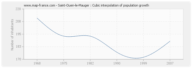 This curve shows the history of the population of Saint-Ouen-le-Mauger from 1968 to 2007 in cubic interpolation. This provides more precisely the population of the municipality of Saint-Ouen-le-Mauger the years where no census has been taken.