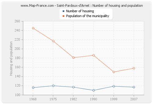 The population of Saint-Pardoux-d'Arnet was 158 inhabitants in 2007, 150 inhabitants in 1999, 186 inhabitants in 1990, 181 inhabitants in 1982, 217 inhabitants in 1975 and 245 inhabitants in 1968. Meanwhile, the number of housing of Saint-Pardoux-d'Arnet was 117 in 2007, 119 in 1999, 110 in 1990, 117 in 1982, 120 in 1975 and 116 in 1968.