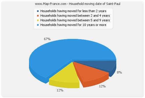 - Number of households of Saint-Paul having moved between 2 and 5 years : 13 - Number of households of Saint-Paul having moved between 5 and 9 years : 13 - Number of households of Saint-Paul having moved for 10 years or more : 71 |