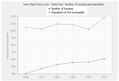 The population of Saint-Paul was 1 185 inhabitants in 2007, 1 022 inhabitants in 1999, 1 088 inhabitants in 1990, 1 096 inhabitants in 1982, 1 026 inhabitants in 1975 and 1 049 inhabitants in 1968. Meanwhile, the number of housing of Saint-Paul was 611 in 2007, 566 in 1999, 560 in 1990, 531 in 1982, 476 in 1975 and 405 in 1968.