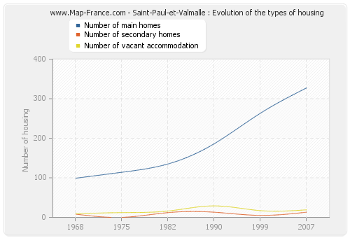 The following graphs show the history of the number and the type of housing of Saint-Paul-et-Valmalle from 1968 to 2007. The second graph is drawn in cubic interpolation. This allows to obtain more exactly the number of accommodation of the town of Saint-Paul-et-Valmalle years where no inventory was made.