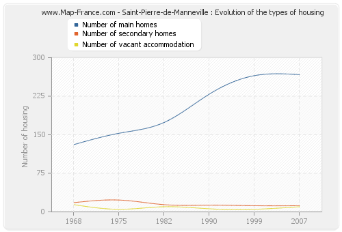 The following graphs show the history of the number and the type of housing of Saint-Pierre-de-Manneville from 1968 to 2007. The second graph is drawn in cubic interpolation. This allows to obtain more exactly the number of accommodation of the town of Saint-Pierre-de-Manneville years where no inventory was made.