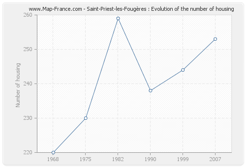 The population of Saint-Priest-les-Fougères was 392 inhabitants in 2007, 412 inhabitants in 1999, 443 inhabitants in 1990, 485 inhabitants in 1982, 508 inhabitants in 1975 and 538 inhabitants in 1968. Meanwhile, the number of housing of Saint-Priest-les-Fougères was 253 in 2007, 244 in 1999, 238 in 1990, 259 in 1982, 230 in 1975 and 220 in 1968.