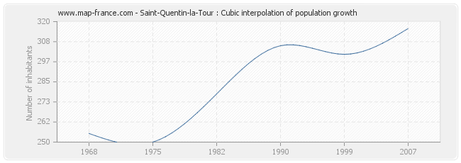 This curve shows the history of the population of Saint-Quentin-la-Tour from 1968 to 2007 in cubic interpolation. This provides more precisely the population of the municipality of Saint-Quentin-la-Tour the years where no census has been taken.