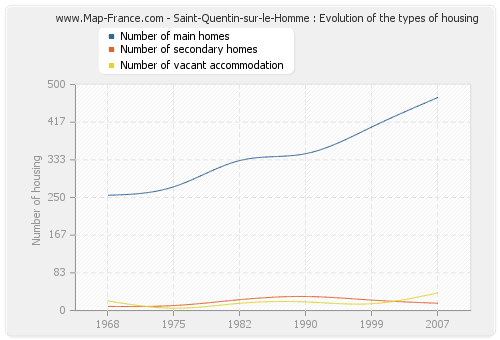 The following graphs show the history of the number and the type of housing of Saint-Quentin-sur-le-Homme from 1968 to 2007. The second graph is drawn in cubic interpolation. This allows to obtain more exactly the number of accommodation of the town of Saint-Quentin-sur-le-Homme years where no inventory was made.