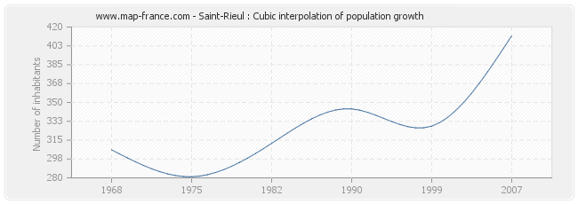 This curve shows the history of the population of Saint-Rieul from 1968 to 2007 in cubic interpolation. This provides more precisely the population of the municipality of Saint-Rieul the years where no census has been taken.