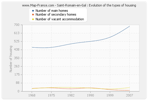 The following graphs show the history of the number and the type of housing of Saint-Romain-en-Gal from 1968 to 2007. The second graph is drawn in cubic interpolation. This allows to obtain more exactly the number of accommodation of the town of Saint-Romain-en-Gal years where no inventory was made.