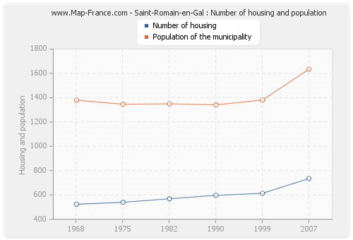 The population of Saint-Romain-en-Gal was 1 634 inhabitants in 2007, 1 380 inhabitants in 1999, 1 341 inhabitants in 1990, 1 349 inhabitants in 1982, 1 346 inhabitants in 1975 and 1 379 inhabitants in 1968. Meanwhile, the number of housing of Saint-Romain-en-Gal was 734 in 2007, 613 in 1999, 596 in 1990, 568 in 1982, 539 in 1975 and 523 in 1968.