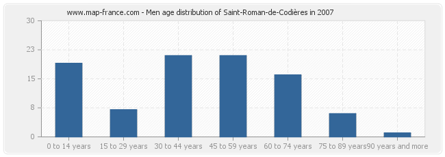 Men population distribution of Saint-Roman-de-Codières by age in 2007 :