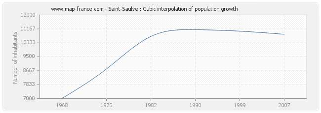Population of Saint-Saulve was 10 845 inhabitants in 2007, 11 033 inhabitants in 1999, 11 122 inhabitants in 1990, 10 717 inhabitants in 1982, 8 766 inhabitants in 1975 and 7 007 inhabitants in 1968.